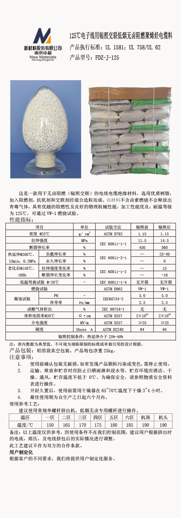 125℃電子線用輻照交聯(lián)低煙無(wú)鹵阻燃聚烯烴電纜料