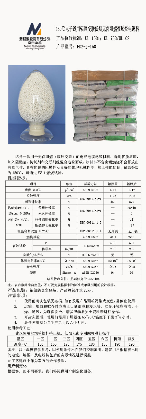 150℃電子線(xiàn)用輻照交聯(lián)低煙無(wú)鹵阻燃聚烯烴電纜料
